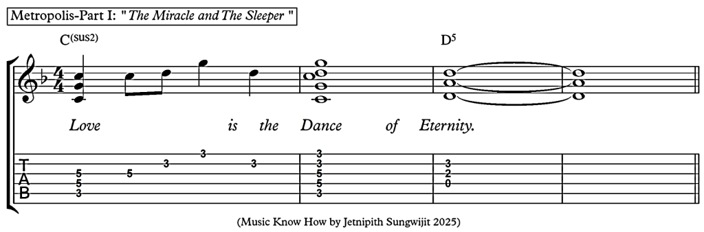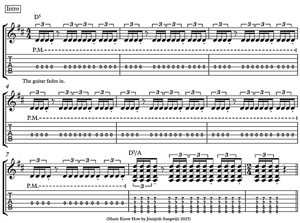 เพื่อให้กระชับจากนี้ผมจะเรียกชื่อเพลงเป็น Overture 1928 เพลงเริ่มต้นด้วยช่วง Intro เริ่มต้นด้วยคอร์ด D5 โดยนำแนวคิดมาจากคอร์ดสุดท้ายในเพลง Metropolis-Part I: “The Miracle and the Sleeper” ถูกนำมาเป็นวัตถุดิบ (ดูตัวอย่างที่ 1 ประกอบ) จะเห็นว่าคอร์ด D5 ก็คือ Power Chord ที่ผมได้กล่าวถึงสาระไปแล้วใน EP.9 การบรรเลงกีตาร์ช่วง Intro ของ Overture 1928 ยังถูกเชื่อมโยงด้วยแนวคิดลักษณะจังหวะที่ปรากฏบนคอร์ด E5 บรรเลงด้วยโน้ต E ตำแหน่งสายเปิดที่ปรากฏช่วง Verse ในเพลง Metropolis-Part I: “The Miracle and the Sleeper” (เวลาที่ปรากฏในเพลงคือ 1.41 นาที) การบรรเลงวนซ้ำ ๆ ลักษณะนี้สร้างเอกลักษณ์ให้กับแนวทำนองกีตาร์ช่วง Verse ของเพลง ภาพรวมอาจพิจารณาเรียกแนวทำนองกีตาร์ช่วงนี้ว่า Verse Riff (ดูตัวอย่างที่ 2 ประกอบ)