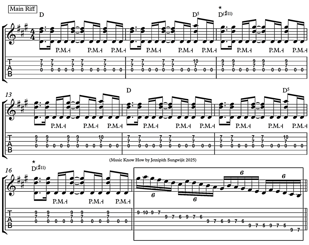 ส่วนกรณีโน้ต G# นั้นอาจพิจารณาได้ 2 มิติคือเป็นโน้ตลำดับขั้นที่ #11 ของคอร์ด D(#11) แต่ถ้าพิจารณาโน้ต G# เป็นโน้ตพ้องเสียงกับโน้ต Ab อาจพิจารณาเป็นคอร์ด Ddim ที่โน้ต Ab แฝงนัยคอร์ด สำหรับกรณีนี้ผมพิจารณาเป็นคอร์ด D(#11) ข้างต้น (สังเกตจากเครื่องหมาย * ตัวอย่างที่ 4) เพื่อให้สอดคล้องกับช่วงท้ายของ Main Riff ซึ่งเชื่อมโยงกับ D Lydian Mode ภาพรวมกีตาร์บรรเลงด้วยลักษณะทางนิ้วแบบ 3 โน้ตต่อ 1 สายมีเอกลักษณ์ตรงโน้ตลำดับขั้นที่ #11 (หรือโน้ตลำดับขั้นที่ #4) ในที่นี้คือโน้ต G# (พิจารณาร่วมกับกรอบสี่เหลี่ยมตัวอย่างที่ 4)