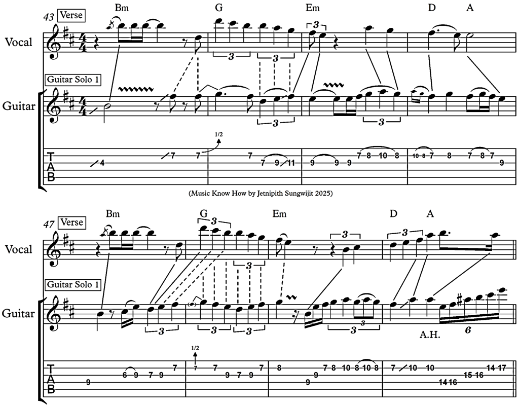 Guitar Solo 1 ปรากฏเวลา 1.35 นาที ภาพรวมเริ่มต้นด้วยกุญแจเสียง B ไมเนอร์โดยห้องที่ 43-50 ใช้วัตถุดิบการดำเนินคอร์ดบางส่วนมาจากช่วง Verse เพลง Metropolis-Part I: “The Miracle and the Sleeper (ปรากฏเวลา 3.08 นาที) มีการดำเนินคอร์ดเป็น Bm-G-Em-D-A นอกจากนี้การสร้างสรรค์แนวทำนองกีตาร์ ยังแฝงไปด้วยนัยสำคัญจากเค้าโครงแนวทำนองร้องช่วง Verse ทั้งโน้ตและลักษณะจังหวะอีกด้วย ซึ่งผมได้นำแนวทำนองมาเปรียบเทียบกันดังตัวอย่างที่ 8 เส้นทึบแสดงถึงการใช้โน้ตเดียวกัน ส่วนเส้นประแสดงถึงใช้ลักษณะจังหวะเดียวกัน (พิจารณาร่วมกับตัวอย่างที่ 8)