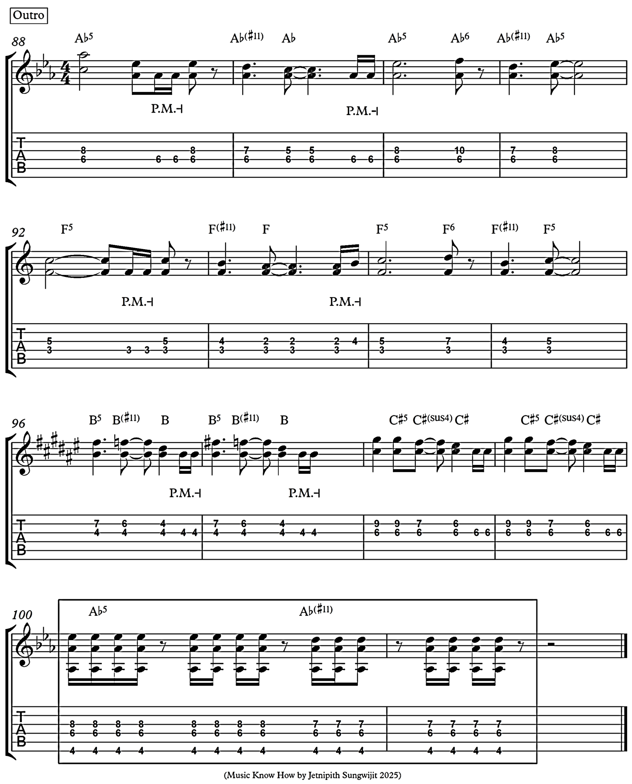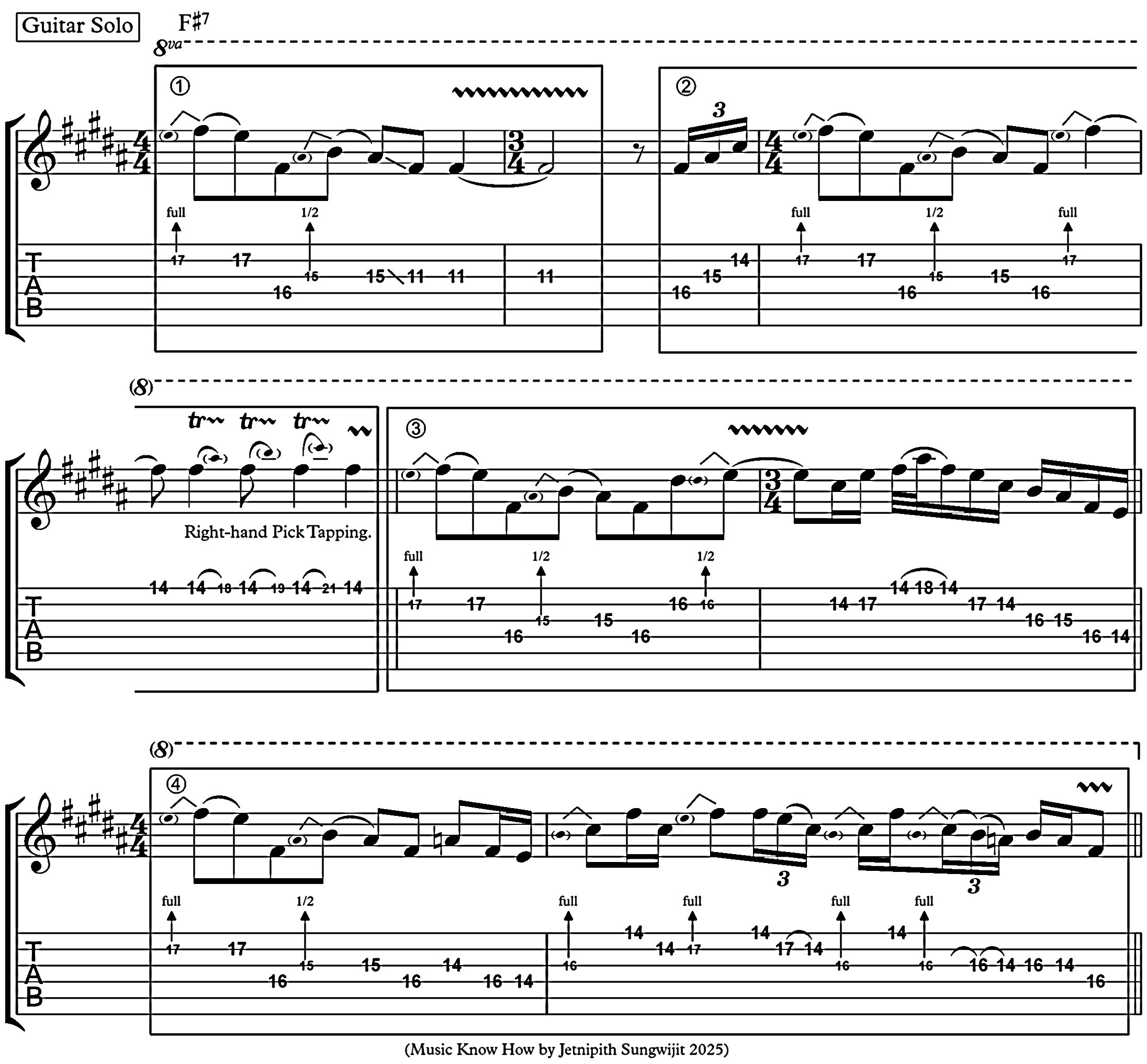 สัญลักษณ์ ④ นำ Motif ที่ปรากฏในแนวทำนองกรอบสี่เหลี่ยมตัวอย่างที่ 9 มาขยายประโยคยาวขึ้นด้วย F# Minor Pentatonic Scale ผสมผสานเทคนิคดันสายร่วมไปกับค่อย ๆ เพิ่มความหนาแน่นลักษณะจังหวะในช่วงท้าย