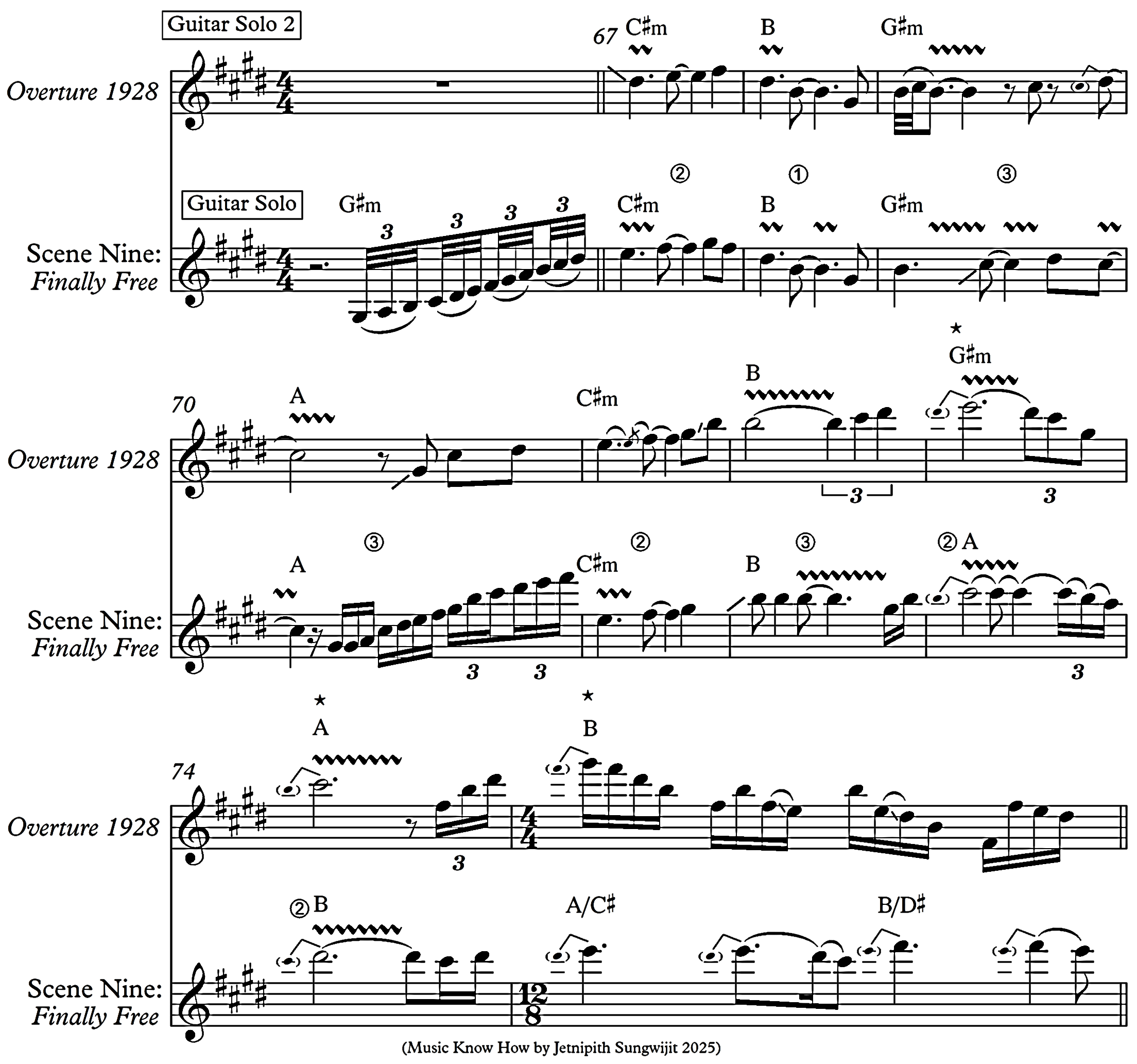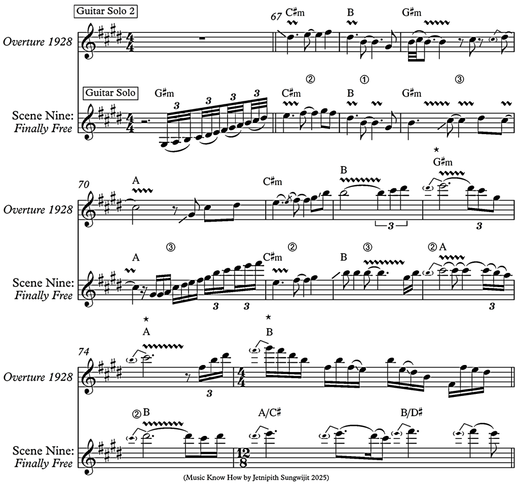 ตัวอย่างที่ 11 เปรียบเทียบแนวทำนองช่วง Guitar Solo เพลง Overture 1928 ห้องที่ 67-75 กับเพลง Scene Nine: Finally Free