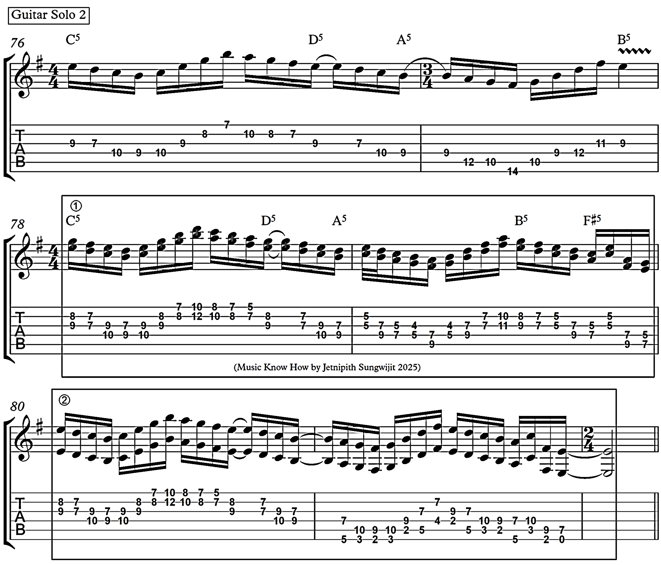 ตัวอย่างที่ 12 แนวทำนอง Guitar Solo 2 เพลง Overture 1928 ห้องที่ 76-82
