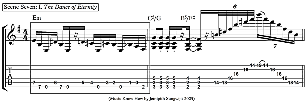 ส่วนตัวอย่างที่ 14 แสดงแนวทำนองเพลง Scene Seven: I. The Dance of Eternity ที่เป็นวัตถุดิบเดียวกัน แนวทำนองจากกรอบสี่เหลี่ยมตัวอย่างที่ 13 ผสมผสาน Chromatic Note สังเกตโน้ตบนตำแหน่งสาย 5 มีทิศทางเคลื่อนที่ลงเริ่มจากโน้ต E-D#-D-C#-C-B-Bb ตามลำดับไปยังโน้ต A เป็นโน้ตตำแหน่งสายเปิดบนสาย 5 ส่วนแนวทำนองตรง Time Signature 7/8 มีเป้าหมายเคลื่อนที่ไปยังโน้ต A ตำแหน่งสายเปิดบนสาย 5 เช่นเดียวกันด้วยการใช้ Chromatic Note ส่วนใหญ่มีทิศทางเคลื่อนที่ลงเริ่มจากโน้ตบนสาย 6 ไปยังสาย 5 ตามลำดับ
