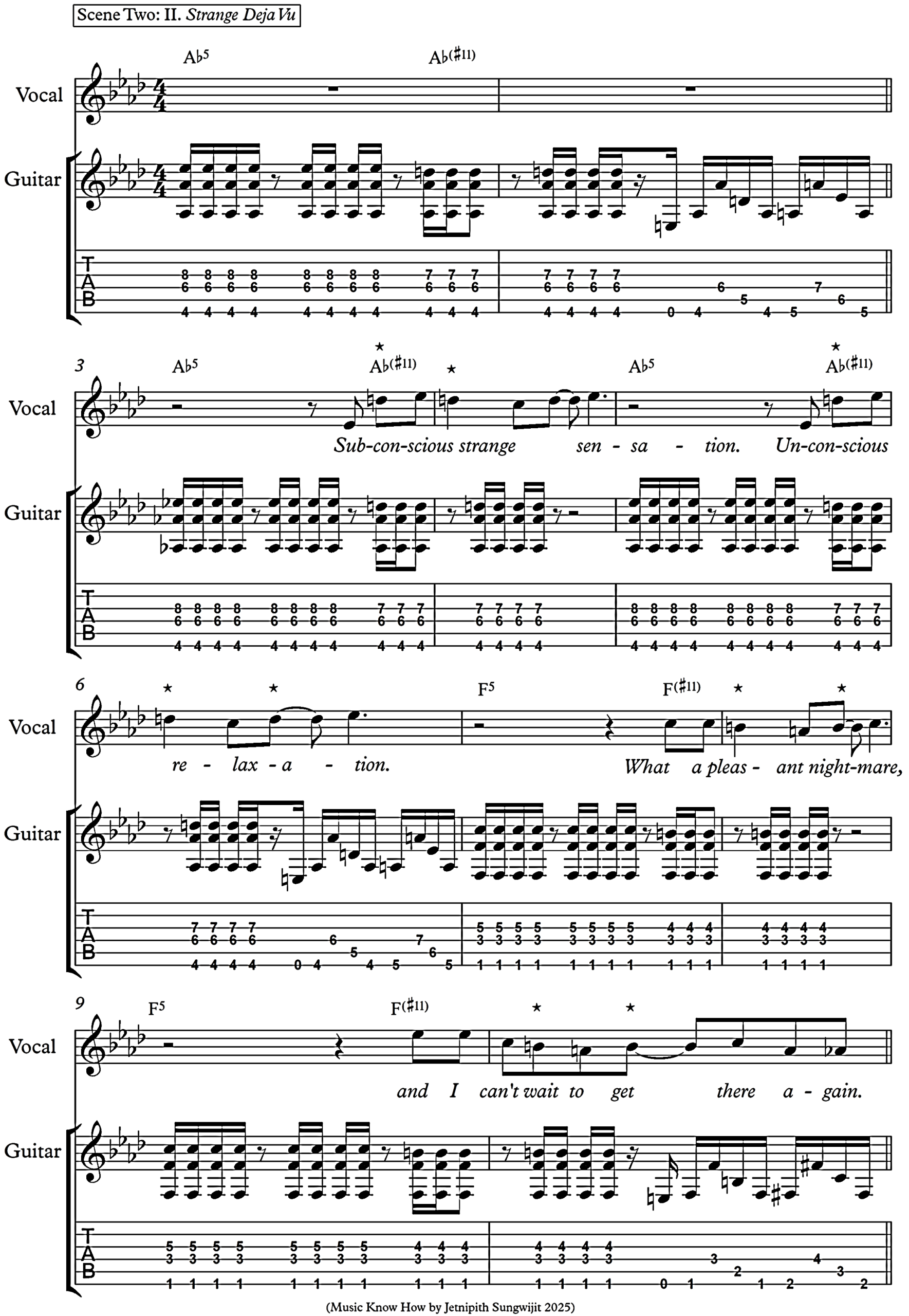 หากพิจารณาความสัมพันธ์ของการดำเนินคอร์ดและแนวทำนอง พบว่ามีการใช้แนวคิด Power Chord รวมถึงแฝงโน้ตลำดับขั้นที่ #11 (หรือโน้ตลำดับขั้นที่ #4) ในแนวทำนองที่สัมพันธ์กับคอร์ด Ab(#11), F(#11), B(#11) จะเห็นความสอดคล้องกันมากยิ่งขึ้นเมื่อพิจารณาร่วมกับแนวทำนองร้องช่วง Verse 1 จากเพลง Scene Two: II. Strange Deja Vu ที่แฝงไปด้วยโน้ตนี้เช่นกัน ผมนำมาแสดงในตัวอย่างที่ 16 สังเกตตรงเครื่องหมาย *